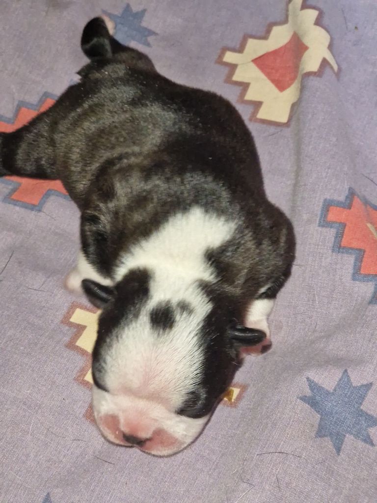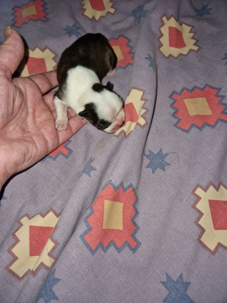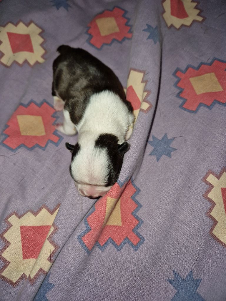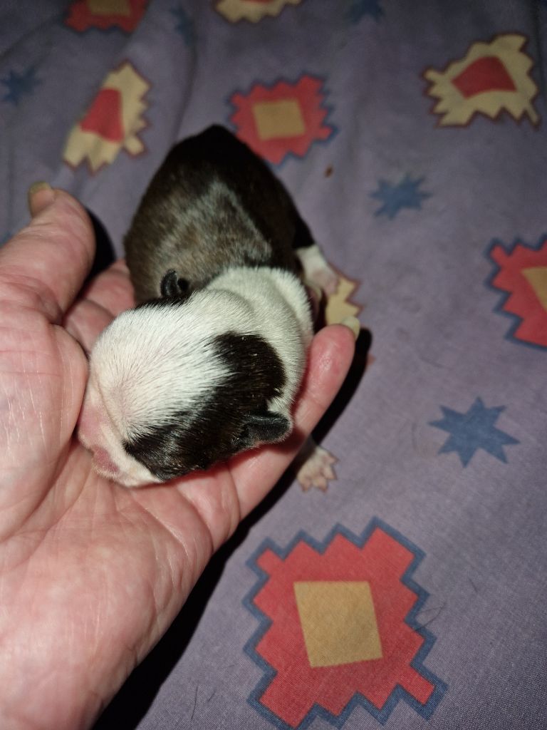 Très beau marquage (les 2 yeux dans le noir), poitrine blanche, pattes avant (chaussettes blanches).fera près probablement partie de la catégorie lourde du standard de la race, c'est à dire, au delà de 9 kg.